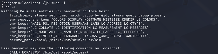 通过sudo -l 查询当前用户被授权通过 sudo 执行的命令。发现该用户存在/bin/cat /root/notes/* sudo权限。
