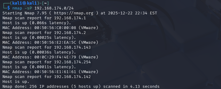 扫描网段确定目标机ip地址(排除其他ip确定靶机ip为192.168.174.143)