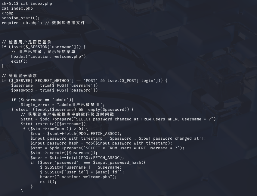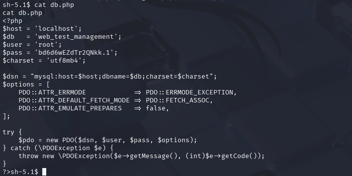 在/var/www/html中找到db.php文件,里面存在数据库用户名与密码。