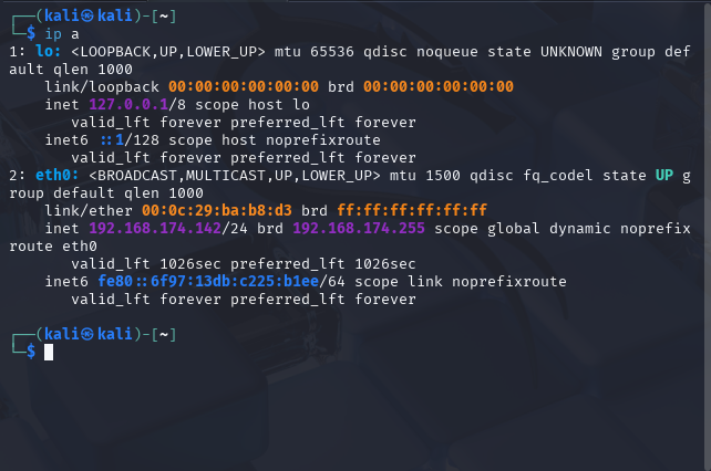 因为攻击机与目标机为同一网段,所以我们先查询攻击机ip确定网段。